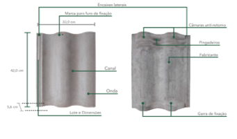 Comprimento: 42 cm Largura: 33 cm Telhas por m²: 10.4 pcs Peso médio por telha: 4 kg Peso médio por m²: 41,6 kg Distância entre ripas (galga): 32 cm Altura da Telha: 5,6 cm Absorção de água: Até 10% Carga de ruptura: Acima de 240 kg Inclinação mínima: 30% Garantia: 20 anos